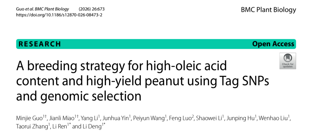 近日,开封市农林科学研究院花生团队在国际学术期刊《BMC Plant Biology》在线发表了题为“A breeding strategy for high-oleic acid content and high-yield peanut using Tag SNPs and genomic selection”的研究论文。该研究成功开发了3个控制花生油酸含量的Tag SNP位点,构建了产量性状的基因组选择预测模型,并将标记辅助育种与基因组选择技术相结合,形成了一套高效的分子育种体系,为高产优质花生新品种的选育提供了重要的理论依据和技术支撑。