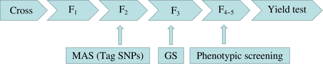 在产量性状方面,研究团队基于参考群体构建了基因组选择模型,获得了各材料的基因组估计育种值(GEBV)。五折交叉验证结果表明,模型的预测能力为0.34,预测准确度为0.59。候选群体验证显示,当基于GEBV的选择强度为30%时,育种效率达到最优。在上述研究基础上,团队建立了“Tag SNP标记辅助选择 + 基因组选择预测”的分子育种体系,旨在同步提升花生的油酸含量与产量(图3)。